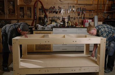Die Verwendung eines einzigen Holzformats reduziert Abfall und vereinfacht die Montage. Multiplexplatten bilden die Oberseite und die untere Ablage, während KVH-Balken den massiven Rahmen bilden.