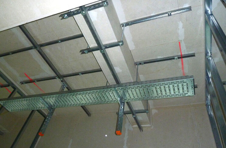 Ein Nachteil der mit Brandschutzbekleidung versehenen Robertson-Decken ist jedoch, dass Versorgungsleitungen innerhalb der abgehängten Decken kaum möglich sind. Umso mehr überzeugte die Bauträgerschaft das von fischer vorgeschlagene Konzept: fischer Befestigungssysteme verankern Trägerstreifen der zweilagigen Promat-Bekleidung zum Brandschutz. Darunter wird ein fischer Installationsschienenrastersystem FUS montiert, das als Trägersystem für alle weiteren Installationssysteme dient.