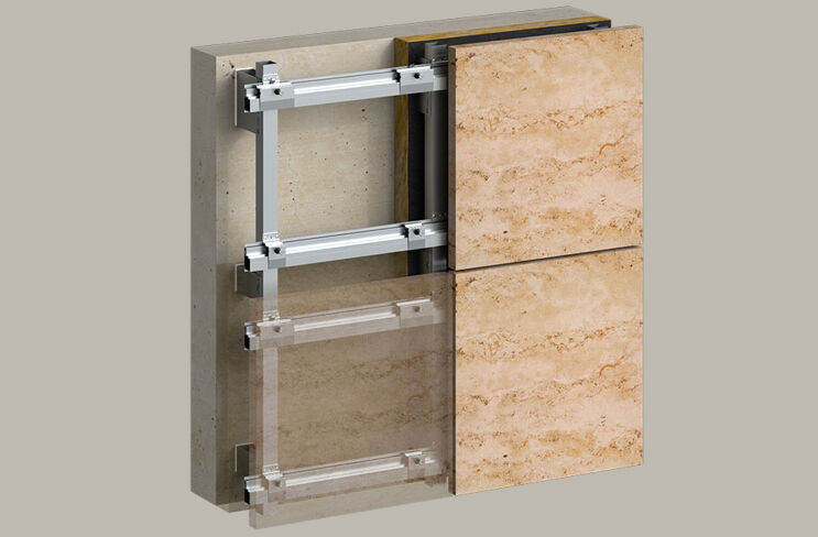 Die horizontale Ebene besteht aus geschlossenen Profilen und Aufhängeklammern. Hinterschnittanker verbinden die Fassadenplatten mit den horizontalen Bauteilen des Unterkonstruktionssystems. Vertikal wird das System mit U- oder Pi-förmigen Wandhaltern und kasten- oder Pi-förmigen Vertikalprofilen sowie den erforderlichen Verbindern und Befestigungen mit dem Untergrund verbunden.
